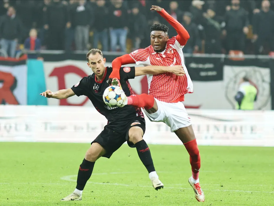 Kennedy Kofi Boateng si Marton Eppel in meciul de fotbal dintre Dinamo Bucuresti si FK Csikszereda Miercurea Ciuc, contand pentru Superliga Superbet, desfasurat pe Arena Nationala din Bucuresti, sambata 8 noiembrie 2025. © FOTO:Gheorghe Fluster/SPORT PICTURES