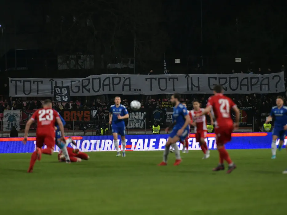Baner al galeriei craiovene cu mesajul: "Tot in groapa, tot in groapa" afisat la meciul de fotbal dintre Dinamo Bucuresti si FC U Craiova, contand pentru Play-out-ul Ligii 1 Casa Pariurilor, desfasurat pe Stadionul Dinamo din Bucuresti, vineri 8 aprilie 2022. © FOTO:Razvan Pasarica/SPORT PICTURES