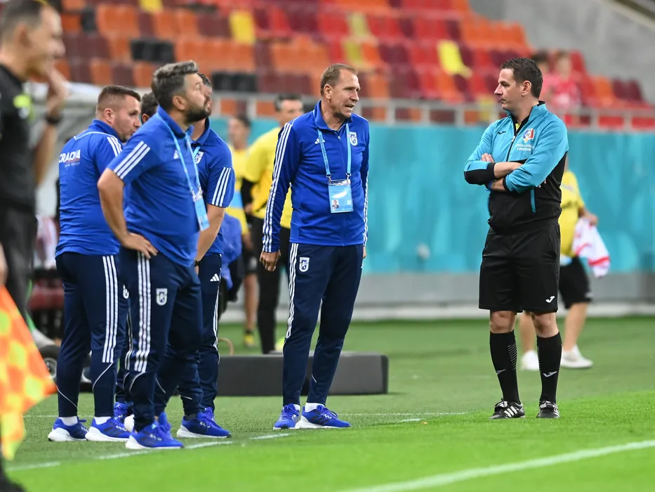 Paul Nelu Raducan discuta cu arbitrul de rezerva Andrei Antonie in meciul de fotbal dintre Dinamo Bucuresti si FC U Craiova, din cadrul Cupei Romaniei Betano, desfasurat pe Arena Nationala din Bucuresti, marti 26 septembrie 2023. © FOTO:Razvan Pasarica/SPORT PICTURES