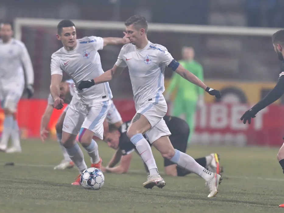 Ioan Andrei Vasile Dumiter si Florin Lucian Tanase in meciul de fotbal dintre Dinamo Bucuresti si FCSB contand pentru Liga 1 Casa Pariurilor, desfasurat pe Stadionul Dinamo din Bucuresti, duminica 30 ianuarie 2022. © FOTO:Razvan Pasarica/SPORT PICTURES