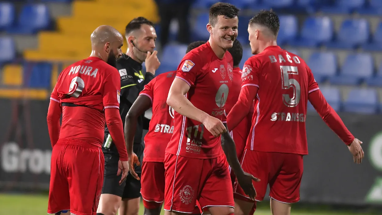 Gabriel De Moura Rodrigues si Razvan Horj discuta dupa penalty-ul acordat impotriva lor in meciul de fotbal dintre FC Viitorul Constanta si Gaz Metan Medias, din cadrul Play-out-ul Ligii 1 Casa Pariurilor, desfasurat fara spectatori pe Stadionul Central al Academiei Gheorghe Hagi din Ovidiu, marti 20 aprilie 2021. © FOTO:Razvan Pasarica/SPORT PICTURES