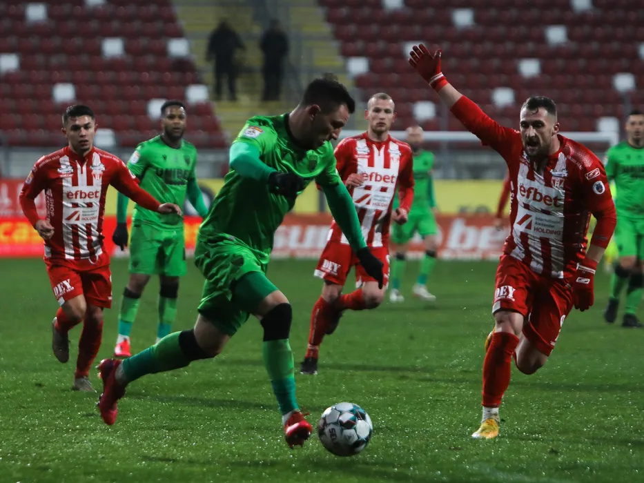 Deian Cristian Sorescu si Sorin Cristian Bustea in meciul de fotbal dintre UTA Arad si Dinamo Bucuresti, contand pentru Liga 1 Casa Pariurilor, desfasurat fara spectatori pe Stadionul Francisc Neuman din Arad, duminica 31 ianuarie 2021. © FOTO:Ciprian Petcut/SPORT PICTURES