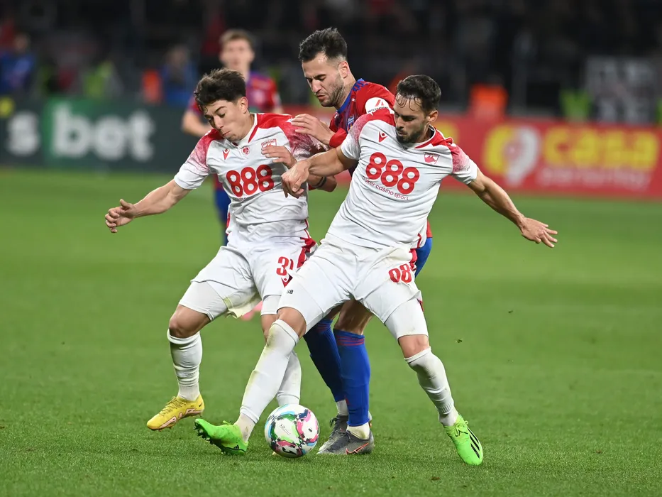 Costin Amzar, Remus Bogdan Chipirliu si Gorka Larrucea in meciul de fotbal dintre CSA Steaua Bucuresti si Dinamo Bucuresti, contand pentru Play-off-ul Ligii a-2-a Casa Pariurilor, desfasurat pe Stadionul Steaua-Ghencea din Bucuresti, marti 18 aprilie 2023. © FOTO:Razvan Pasarica/SPORT PICTURES