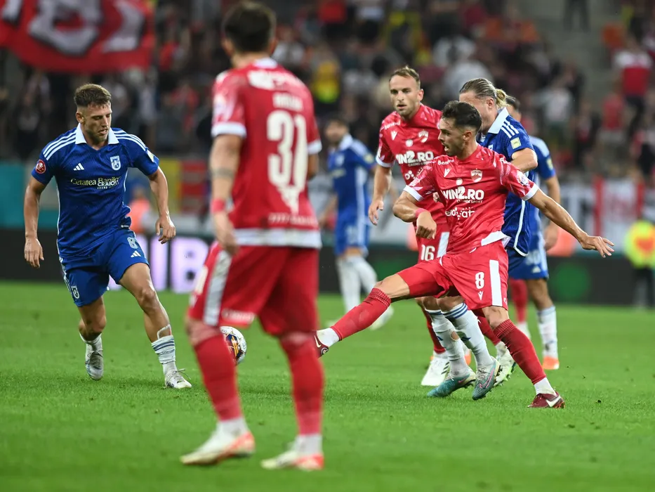 Constantin Dragos Albu si Gorka Larrucea Arrien in meciul de fotbal dintre Dinamo Bucuresti si FC U Craiova, din cadrul Superligii Superbet, desfasurat pe Arena Nationala din Bucuresti, vineri 15 septembrie 2023. © FOTO:Razvan Pasarica/SPORT PICTURES