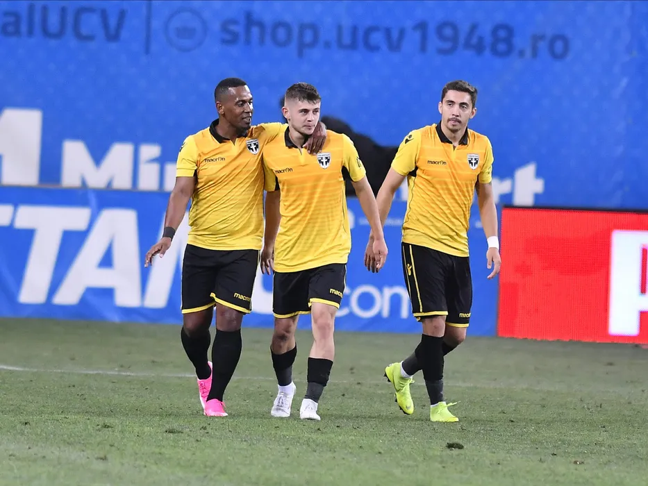 Fotbalistii Voluntariului Eric De Oliveira Pereira, Cristian Ionut Costin si Razvan Toni Gradinaru se bucura dupa un gol marcat in meciul de fotbal dintre Universitatea Craiova si FC Voluntari, contand pentru Liga 1 Casa Pariurilor, desfasurat fara spectatori pe Stadionul Ion Oblemenco din Craiova, sambata 19 septembrie 2020. © FOTO:Razvan Pasarica/SPORT PICTURES