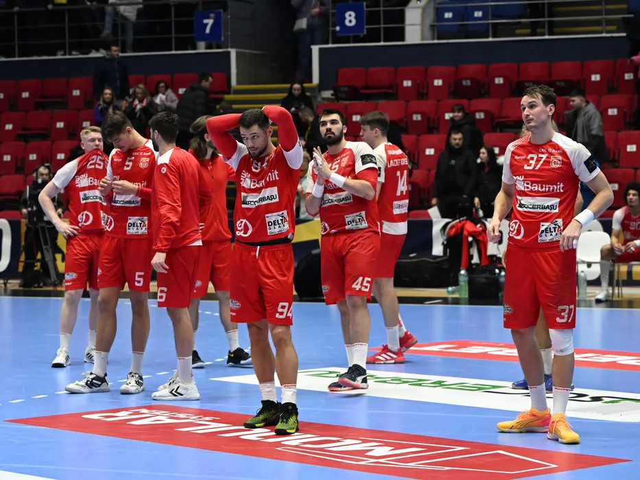Handbalistii dinamovisti Haukur Thrastarson, Calin Dedu, Robert Mihai Militaru, Rosta Miklos, Frederick Ladefoged Blazejewicz si Stanislav Kasparek dezamagiti dupa meciul de handbal masculin dintre Dinamo Bucuresti si Orlen Wisla Plock, din cadrul EHF Champions League, desfasurat in Sala Polivalenta-Ioan Kunst Ghermanescu din Bucuresti, miercuri 26 februarie 2025. © FOTO:Razvan Pasarica/SPORT PICTURES