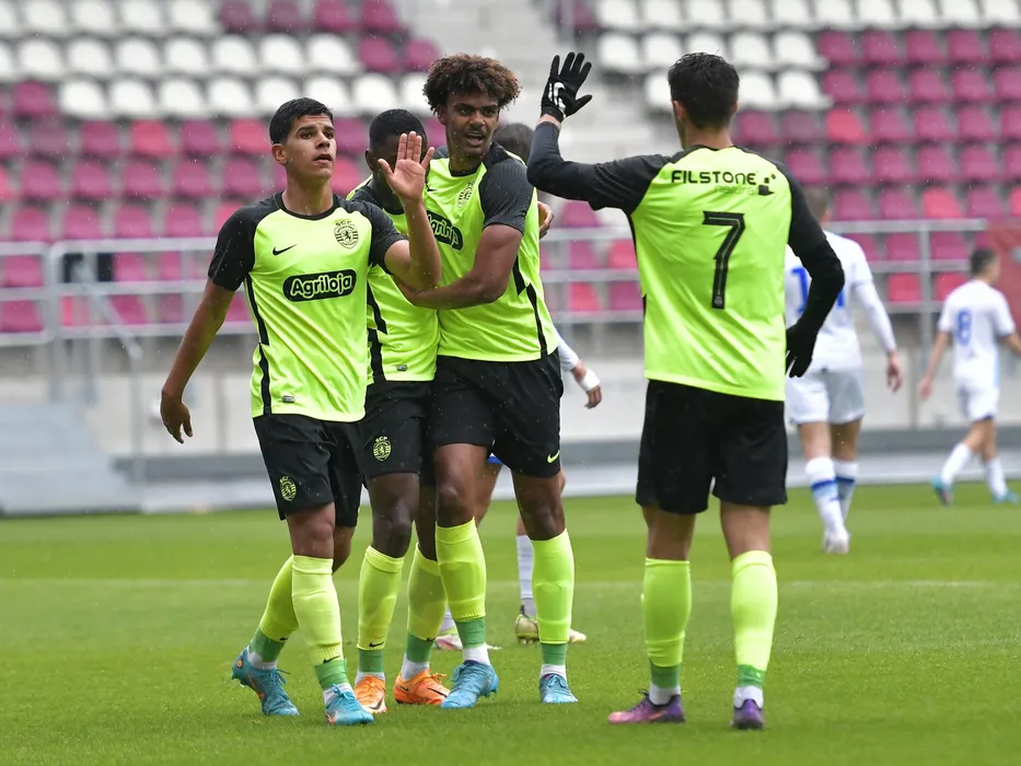 Bucurie portugheza la golul lui Diogo Cabral in meciul de fotbal dintre Dinamo Kiev U19 si Sporting Club Portugal U19, din cadrul UEFA Youth League, desfasurat pe Stadionul Rapid Giulesti din Bucuresti, joi 7 aprilie 2022. © FOTO:Razvan Pasarica/SPORT PICTURES