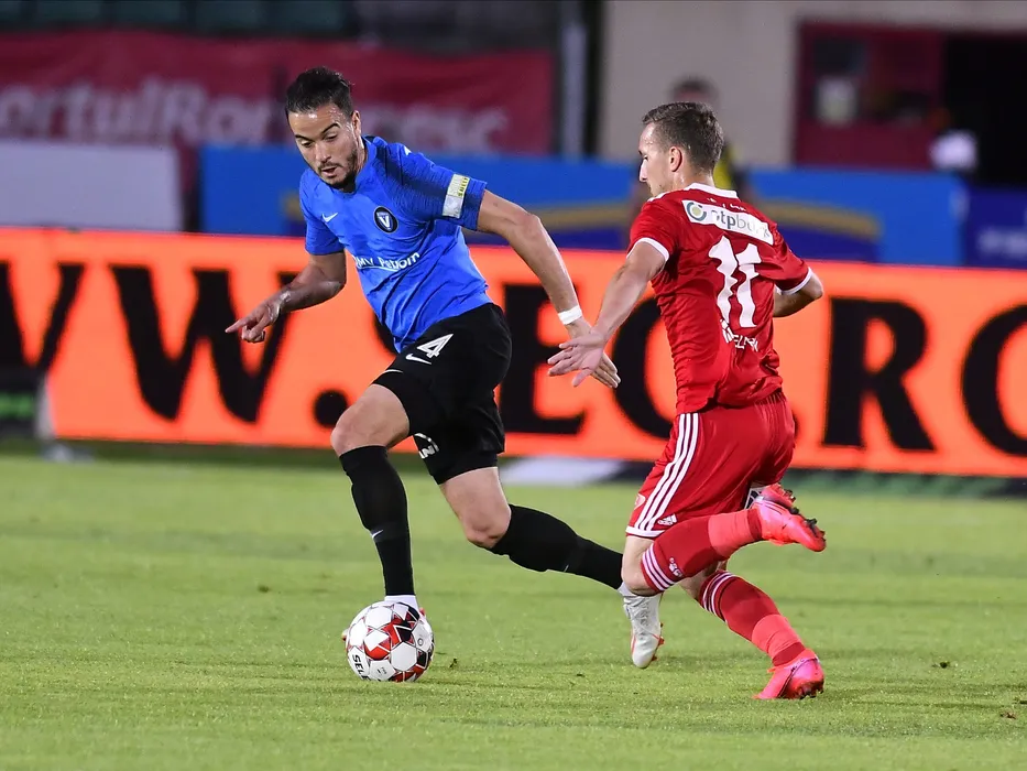 Damien Dylan Dussaut si Marius Stefanescu in meciul de fotbal dintre Sepsi OSK si FC Viitorul, contand pentru play-out-ul Ligii 1 Casa Pariurilor, disputat fara spectatori pe stadionul Municipal din Sfantu Gheorghe, sambata 27 iunie 2020.