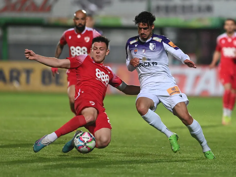 Deniz Giafer si Vianna Fabio Andre Freitas in meciul de fotbal dintre FC Arges si Dinamo Bucuresti, contand pentru mansa retur a Barajului pentru mentinerea in Superliga Superbet, desfasurat pe Stadionul Orasenesc din Mioveni, sambata 3 iunie 2023. © FOTO:Razvan Pasarica/SPORT PICTURES