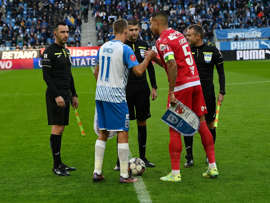 Brigada de arbitrii formata din Vasile Marinescu, Andrei Florin Chivulete si Andrei Constantinescu alaturi de capitanii Nicusor Silviu Bancu si Lucas Alves De Araujo in meciul de fotbal dintre Universitatea Craiova si Dinamo Bucuresti, contand pentru Superliga Superbet, desfasurat pe Stadionul Ion Oblemenco din Craiova, duminica 12 noiembrie 2023. © FOTO:Razvan Pasarica/SPORT PICTURES