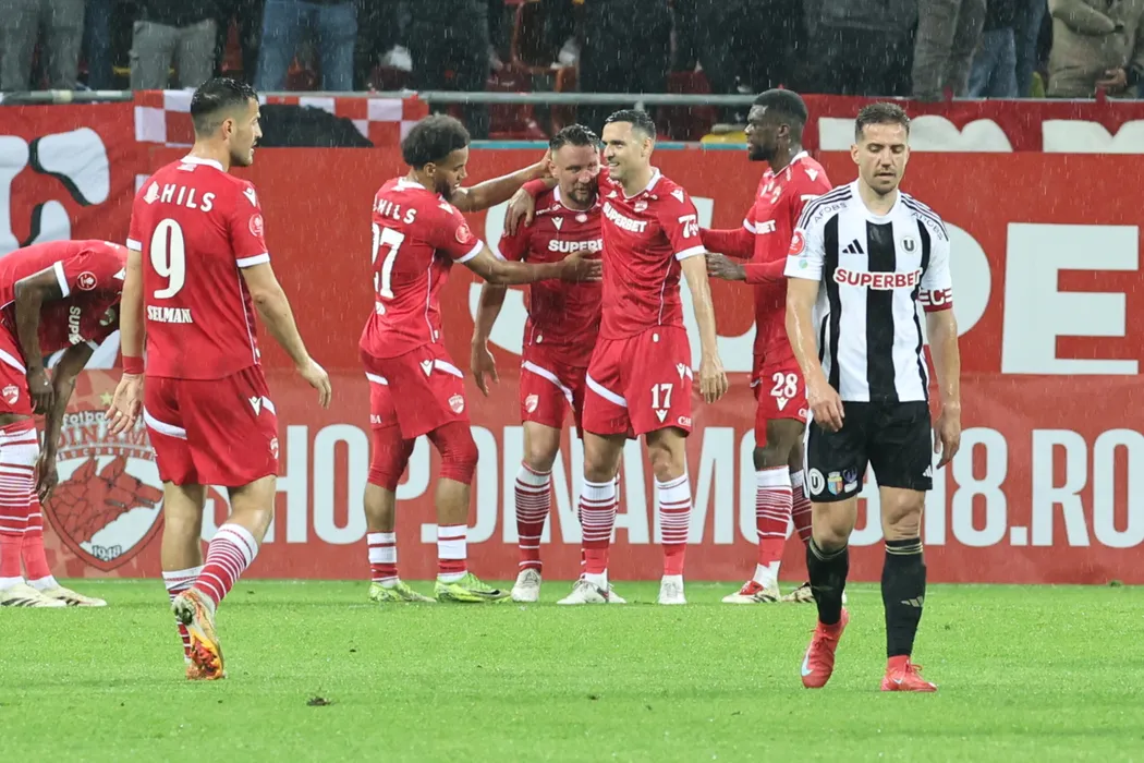 Razvan Bogdan Patriche Nichita felicitat de Georgi Ventsislavov Milanov, Josue Francis Homawoo, Maxime James Sivis la momentul schimbarii in meciul de fotbal dintre Dinamo Bucuresti si Universitatea Cluj, contand pentru SuperLiga Superbet Play-Off, desfasurat pe Stadionul Arena Nationala din Bucuresti, vineri 16 mai 2025. © FOTO: Gheorghe Fluster/SPORT PICTURES