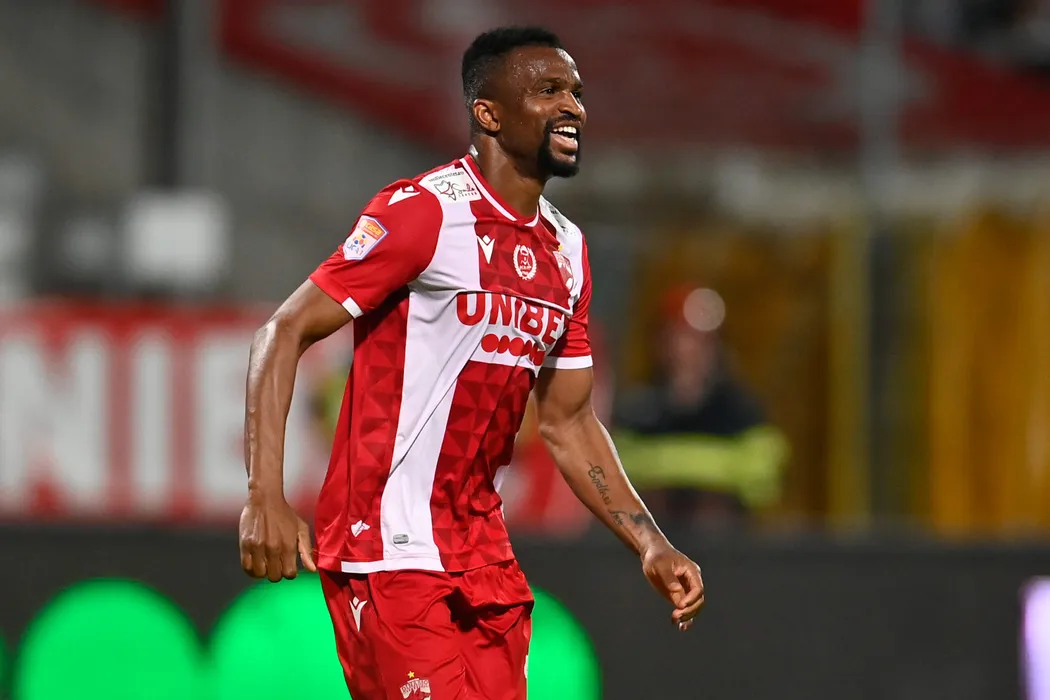 Christian Irobiso reactioneaza dupa ce a marcat in timpul partidei dintre Dinamo si UTA Arad, partida disputata in cadrul etapei cu numarul noua a play-out-ului Ligii 1 de fotbal, vineri, 13 mai 2022, pe stadionul Stefan Cel Mare din Bucuresti. EDUARD VINATORU / MEDIAFAX FOTO