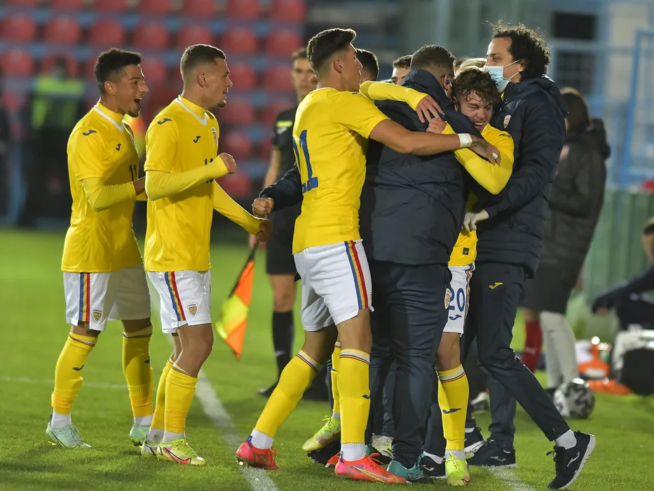Eduard Radaslavescu se bucura dupa un gol marcat alaturi de Robert Mustaca, Ovidiu Perianu si Andrei Marginean in meciul amical de fotbal dintre Romania U20 si Cehia U20, desfasurat pe Stadionul Anghel Iordanescu din Voluntari, joi 7 octombrie 2021. © FOTO:Razvan Pasarica/SPORT PICTURES