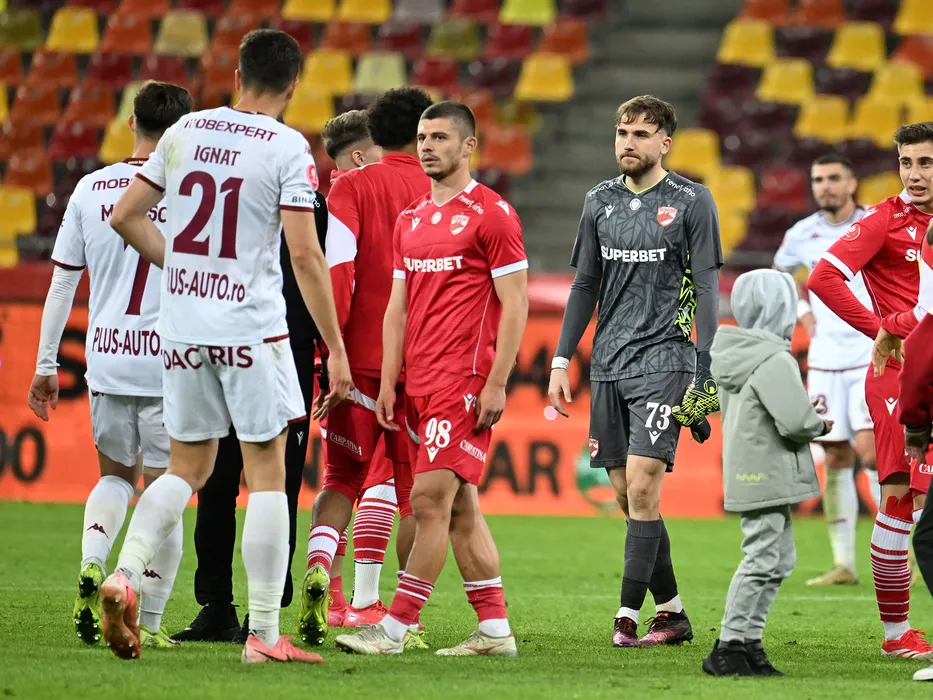 Cristian Ionuț Costin si Alexandru Vasile Rosca Ailiesei dupa meciul de fotbal dintre Dinamo Bucuresti si Rapid Bucuresti, contand pentru Play off-ul Superligii Superbet, desfasurat pe Arena Nationala din Bucuresti, luni 12 mai 2025. © FOTO:Razvan Pasarica/SPORT PICTURES