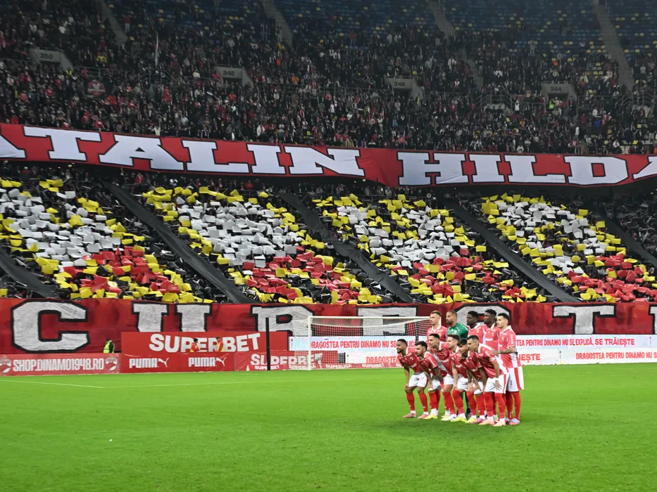 Fotbalistii dinamovisti la o fotografie de grup realizata alături de galerie inaintea meciului de fotbal dintre Dinamo Bucuresti si Rapid Bucuresti, din cadrul Superligii Superbet, desfasurat pe Arena Nationala din Bucuresti, duminica 19 octombrie 2025. © FOTO:Razvan Pasarica/SPORT PICTURES