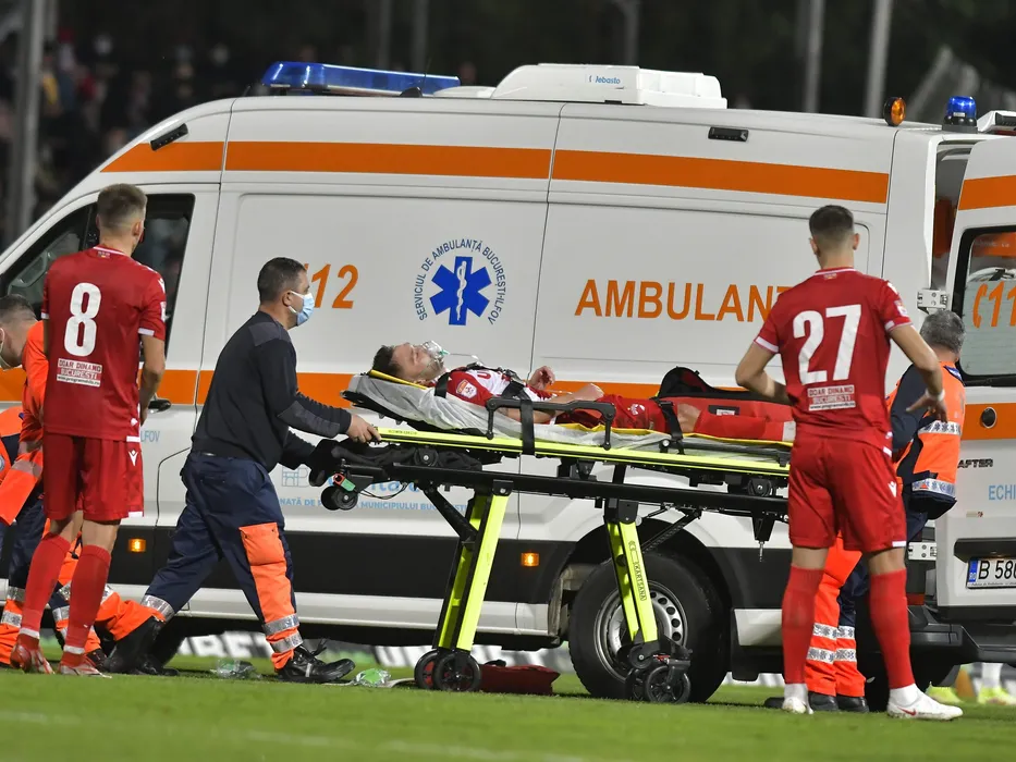 Alexandru Ilie Rauta dus pe targa spre ambulanta la meciul de fotbal dintre Dinamo Bucuresti si Rapid Bucuresti, contand pentru Liga 1 Casa Pariurilor, desfasurat pe Stadionul Dinamo din Bucuresti, sambata 23 octombrie 2021. © FOTO:Razvan Pasarica/SPORT PICTURES
