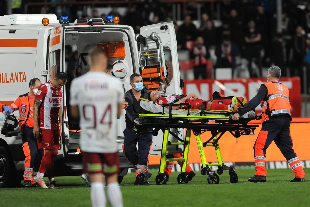 Alexandru Rauta, de la Dinamo, este scos cu targa de pe terenul de joc dupa ce s-a accidentat in timpul meciului de fotbal contra echipei Rapid din etapa a XIII-a a Ligii 1, disputat pe stadionul Dinamo din Bucuresti, sambata, 23 octombrie 2021. GEORGE FILIP / MEDIAFAX FOTO