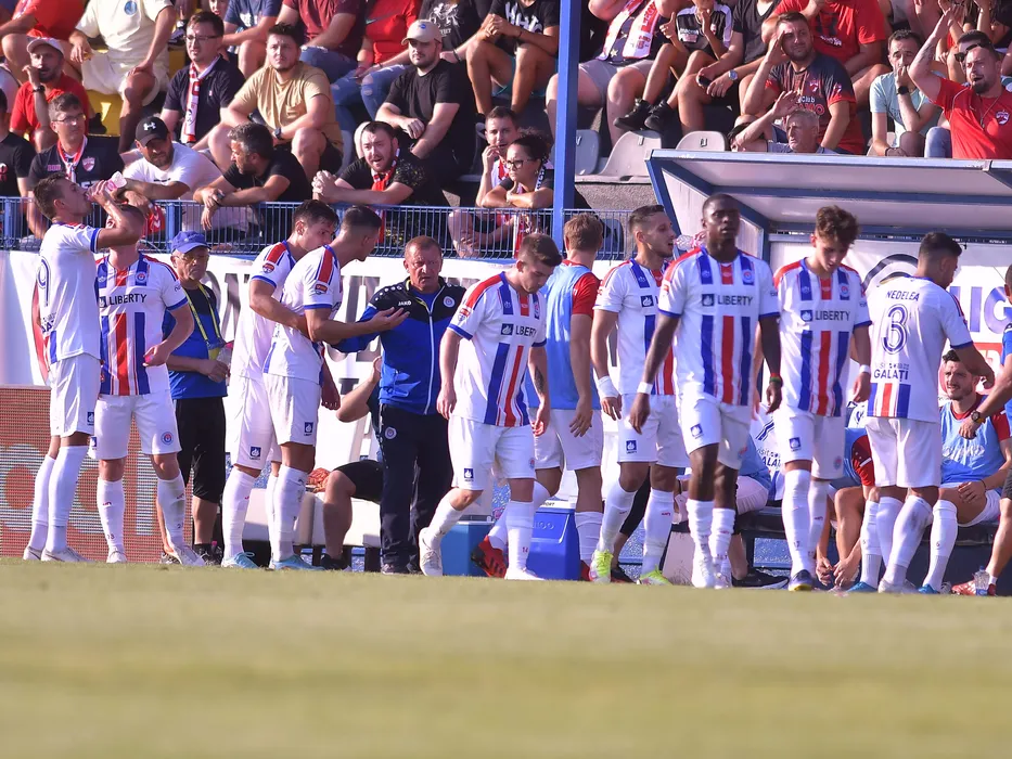 Fotbalistii galateni alaturi de antrenorul lor Dorinel Munteanu la golul reusit de catre Razvan Gorovei in meciul de fotbal dintre Dinamo Bucuresti si Otelul Galati, contand pentru Liga 2, desfasurat pe Clinceni Arena din Clinceni 2022, marti 16 august 2022. © FOTO:Razvan Pasarica/SPORT PICTURES