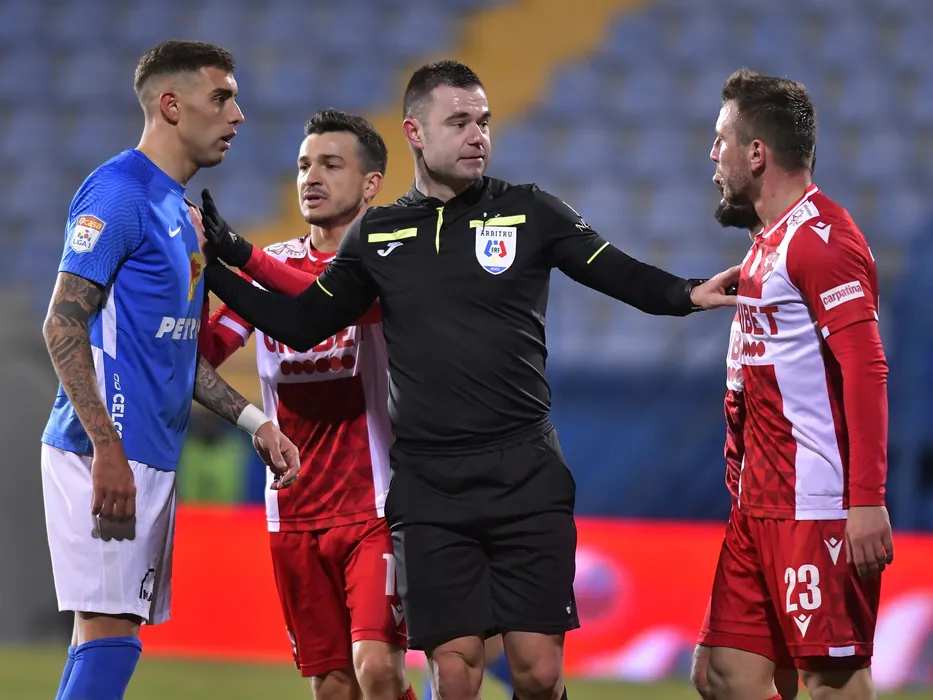 Arbitrul central Eduard Ionita alaturi de Jefte Betancor Sanchez, Cosmin Gabriel Matei si Razvan Patriche in meciul amical de fotbal dintre Farul Constanta si Dinamo Bucuresti, desfasurat pe Stadionul central al Academiei Gheorghe Hagi din Ovidiu, sambata 15 ianuarie 2022. © FOTO:Razvan Pasarica/SPORT PICTURES
