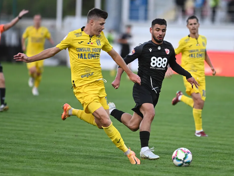 Ciprian Perju si Antonio Bordusanu in meciul de fotbal dintre Dinamo Bucuresti si Unirea Slobozia, contand pentru Liga 2 Casa Pariurilor, desfasurat pe Stadionul Marin Anastasovici din Giurgiu, marti 4 octombrie 2022. © FOTO:Razvan Pasarica/SPORT PICTURES