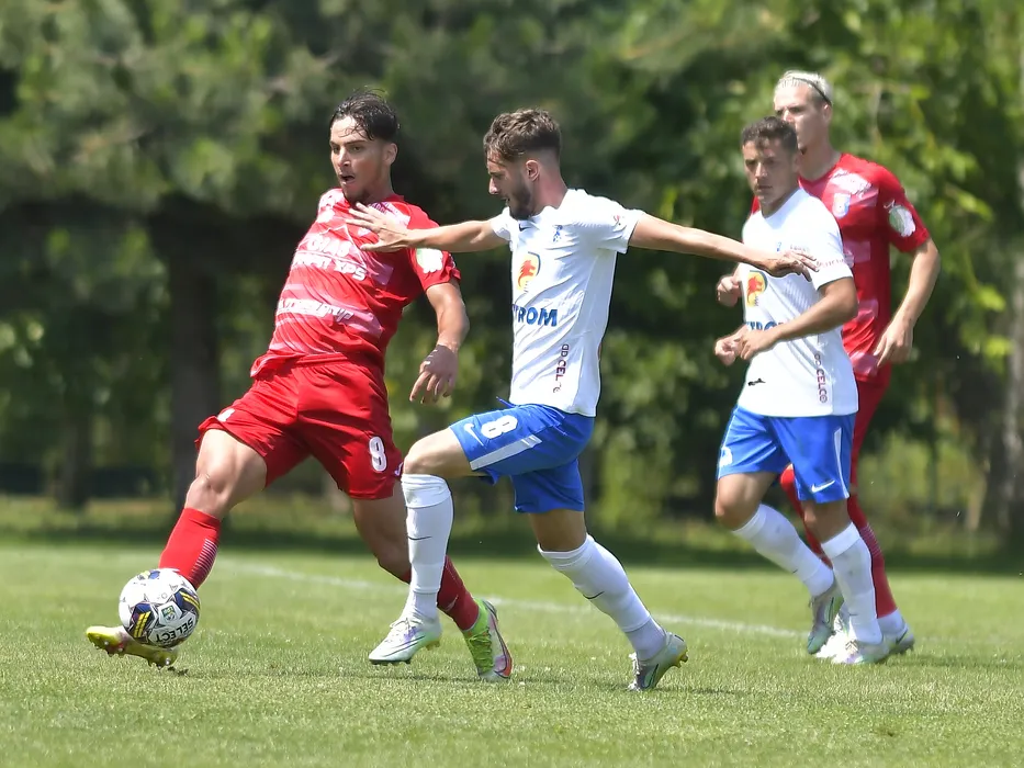 Marco Alexandru Dulca si Carlo Casap in meciul amical de fotbal dintre Farul Constanta si Chindia Targoviste, desfasurat la Baza Campo Verde din Ghimbav, sambata 2 iulie 2022. © FOTO:Razvan Pasarica/SPORT PICTURES