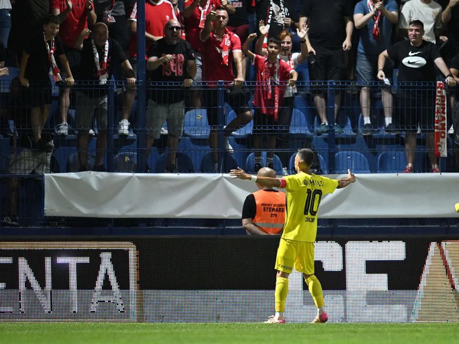 Catalin Ionut Cirjan se bucură dupa un gol marcat alături de suporterii dinamovisti la meciul de fotbal dintre Metaloglobus Bucuresti si Dinamo Bucuresti, contand pentru Superliga Superbet, desfasurat pe Clinceni Arena din Clinceni, vineri 8 august 2025. © FOTO:Razvan Pasarica/SPORT PICTURES