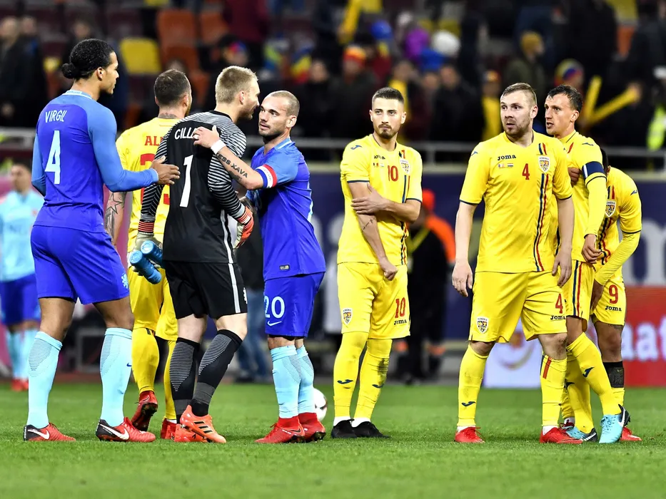 Wesley Sneijder,Gicu Grozav,Vlad Chiriches si Cosmin Moti dupa meciul amical de fotbal dintre Romania si Olanda, desfasurat marti 14 noiembrie 2017 pe Arena Nationala din Bucuresti. © FOTO Razvan Pasarica/SPORT PICTURES
