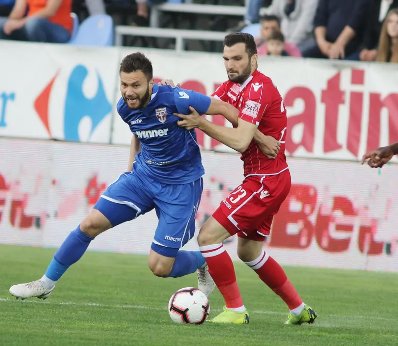 Ionut Serban de la Dinamo Bucuresti (echipament rosu) incearca sa preia controlul balonului de la Ionut Balaur jucator al FC Voluntari, in timpul unei partide desfasurata in etapa a 6- a a play-off-ului Ligii 1 la fotbal, sambata 27 aprilie 2019, in Voluntari, Ilfov. GEORGE FLUSTER / MEDIAFAX FOTO