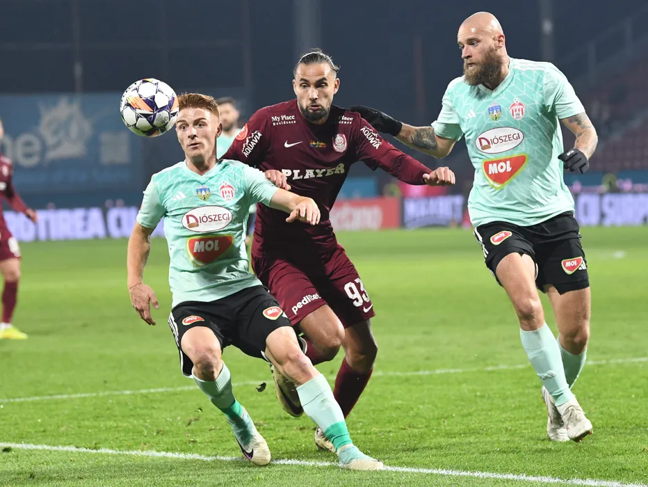 Virgiliu Postolachi și Branislav Ninaj, Andres Mihai Dumitrescu în meciul de fotbal dintre FC CFR 1907 Cluj si Sepsi OSK Sfântu Gheorghe, contând pentru Superliga Superbet, desfășurat pe Stadionul Dr.Constantin Rădulescu din Cluj-Napoca, vineri 25 octombrie 2024. © FOTO: Flaviu BUBOI/SPORT PICTURES
