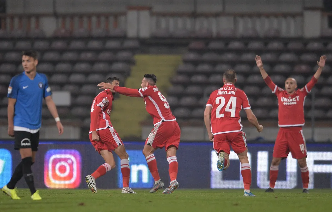 Jucatorii formatiei Dinamo se bucura dupa inscrierea unui gol, in timpul meciului de fotbal contra echipei FC Viitorul, din etapa a XIV-a a Ligii 1 Casa Pariurilor, disputat pe stadionul Dinamo din Bucuresti, duminica, 27 octombrie 2019. ALEXANDRU DOBRE/ MEDIAFAX FOTO