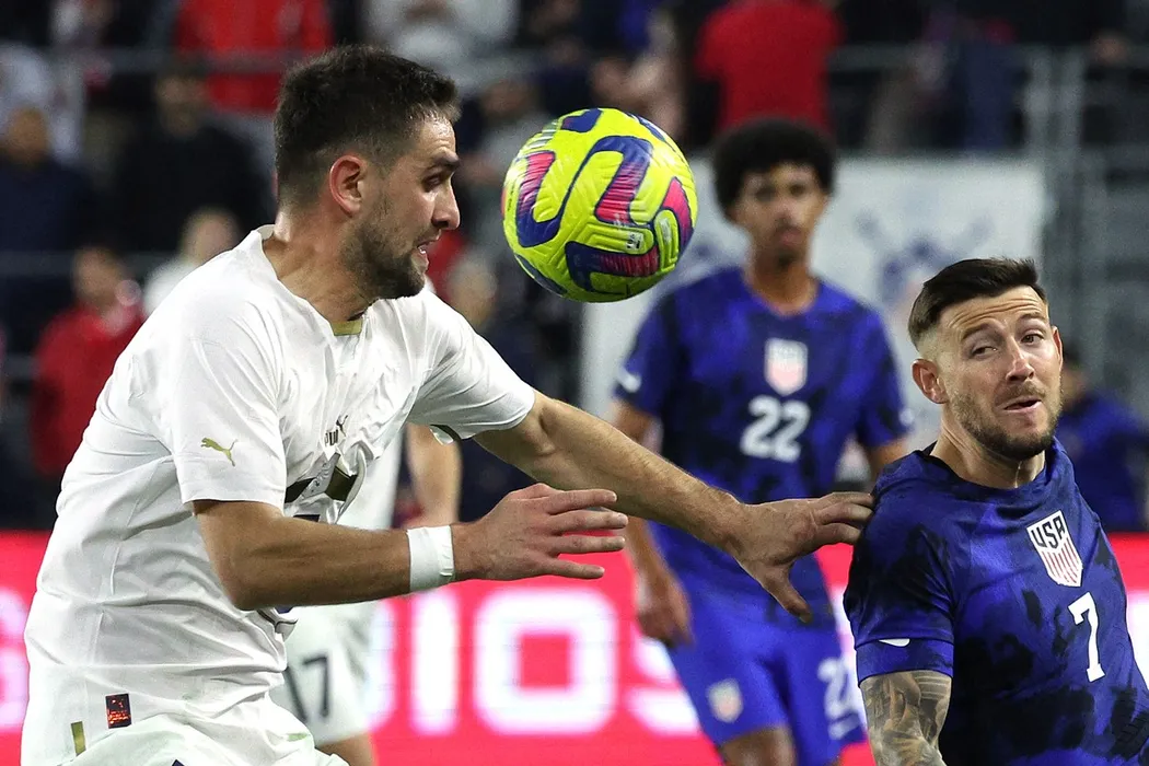 LOS ANGELES, CALIFORNIA - JANUARY 25: Paul Arriola #7 of the United States clears the ball against Marko Mijailovic #5 of Serbia during the second half in the International Friendly match at BMO Stadium on January 25, 2023 in Los Angeles, California. Harry How,Image: 751946158, License: Rights-managed, Restrictions: , Model Release: no