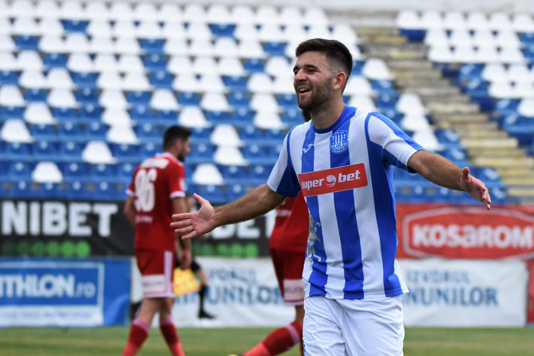 Ovidiu Horsia, de la CSM Politehnica Iasi, reactioneaza dupa inscrierea unui gol in timpul meciului de fotbal contra echipei Sepsi OSK din etapa a VIII-a a play-out-ului Ligii 1 Casa Pariurilor, disputat pe stadionul Emil Alexandrescu din Iasi, duminica, 5 iulie 2020. DRAGOS PASCANEANU/ MEDIAFAX FOTO