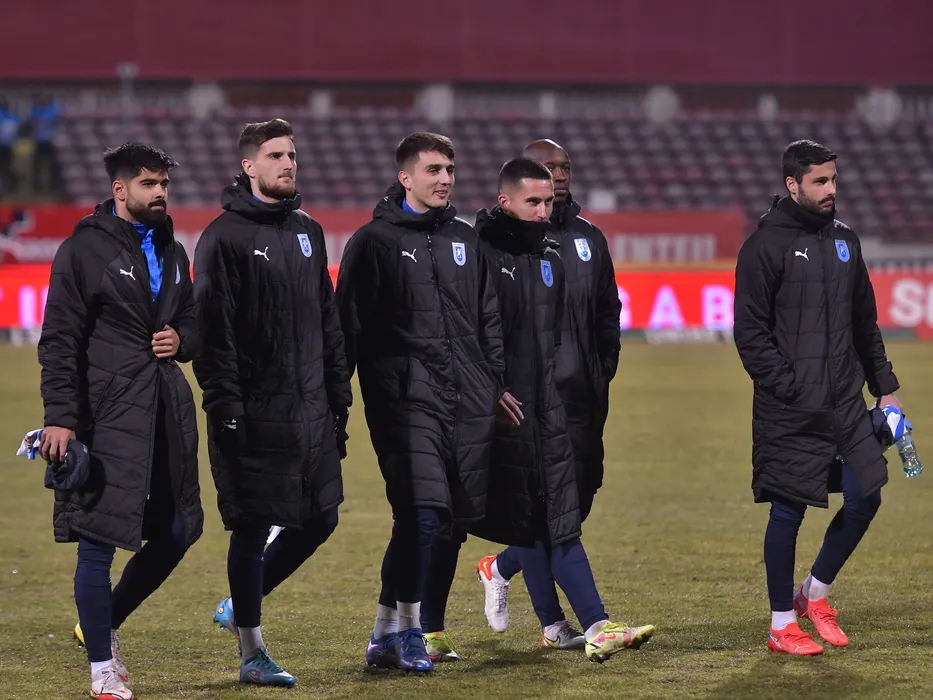 Rezervele Craiovei Ionut Daniel Vina, Mihai Cristian Capatina, Stefan Marinel Vladoiu, Ovidiu Alexandru Bic, Antoine Conte si Alberto Constantin Calin la meciul de fotbal dintre Dinamo Bucuresti si Universitatea Craiova, contand pentru Liga 1 Casa Pariurilor, desfasurat pe Stadionul Dinamo din Bucuresti, joi 10 februarie 2022. © FOTO:Razvan Pasarica/SPORT PICTURES