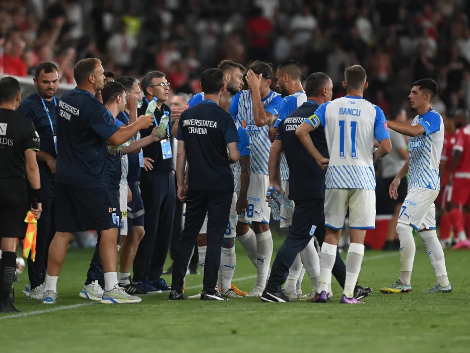 Eugen Neagoe alaturi de fotbalistii craioveni la o pauza de hidratare luata in meciul de fotbal dintre Dinamo Bucuresti si Universitatea Craiova, din cadrul Superligii Superbet, desfasurat pe Stadionul National Arcul de Triumf din Bucuresti, luni 17 iulie 2023. © FOTO:Razvan Pasarica/SPORT PICTURES