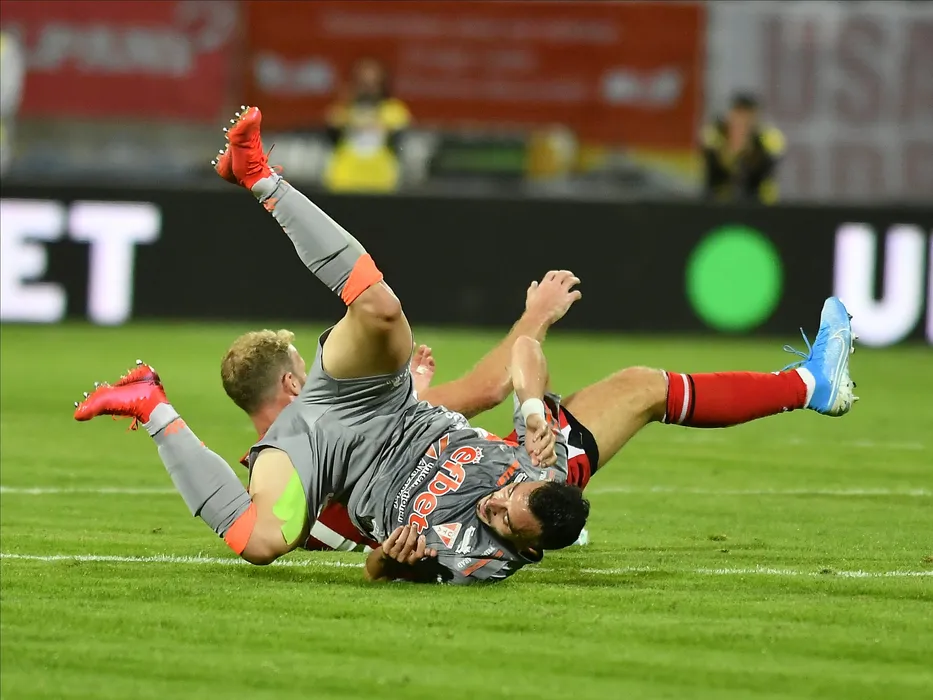 Ioan Hora si Adam Nemec la pamant cu picioarele in sus in meciul de fotbal dintre Dinamo Bucuresti si UTA Arad, contand pentru Liga 1 Casa Pariurilor, desfasurat fara spectatori pe Stadionul Dinamo din Bucuresti, luni 28 septembrie 2020. © FOTO:Razvan Pasarica/SPORT PICTURES