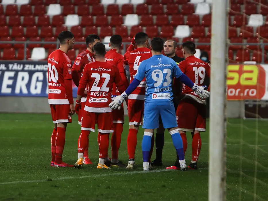 Fotbalistii aradeni la discutii cu arbitrul central Catalin Popa in meciul de fotbal dintre UTA Arad si Dinamo Bucuresti, contand pentru Liga 1 Casa Pariurilor, desfasurat fara spectatori pe Stadionul Francisc Neuman din Arad, duminica 31 ianuarie 2021. © FOTO:Ciprian Petcut/SPORT PICTURES