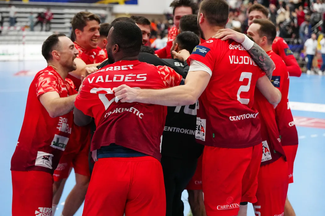 Handbalistii dinamovisti se bucura dupa victoria obtinuta in meciul de handbal masculin dintre CS Dinamo Bucuresti si HBC Nantes, contand pentru EHF Champions League, desfasurat in Sala Polivalenta Dinamo din Bucuresti, joi 20 noiembrie 2025. © FOTO:Mihai Neacsu/SPORT PICTURES