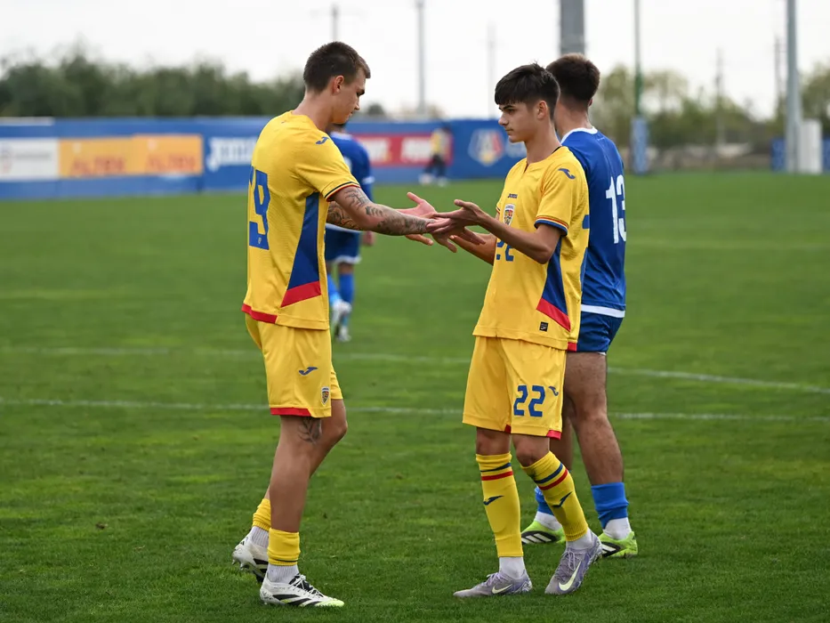 Ianis Doana il felicita pe Troy Tomsa dupa un gol marcat in meciul amical de fotbal dintre Romania U19 si Cipru U19, desfasurat pe Stadionul central din cadrul Centrului National de Fotbal Buftea, marti 14 octombrie 2025. © FOTO:Razvan Pasarica/SPORT PICTURES