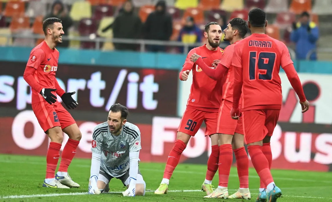 Bucurie a fotbalistilor stelisti dupa un gol marcat cu Razvan Constantin Oaida, Gheorghe Bogdan Rusu si Florinel Teodor Coman spre dezamagirea lui Eduard Adrian Pap in meciul de fotbal dintre FCSB si FC Botosani, contand pentru Superliga Superbet, desfasurat pe Arena Nationala din Bucuresti, luni 19 decembrie 2022. © FOTO:Razvan Pasarica/SPORT PICTURES