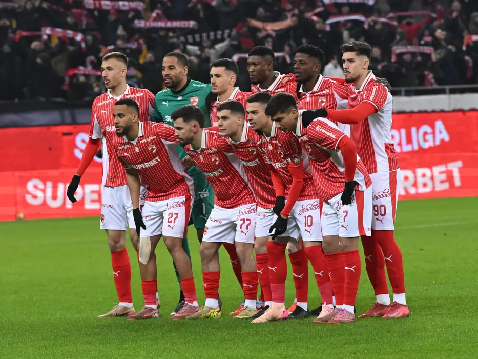 Fotbalistii dinamovisti la o fotografie de grup realizata inaintea meciului de fotbal dintre Dinamo Bucuresti si Universitatea Craiova, din cadrul Superligii Superbet, desfasurat pe Arena Nationala din Bucuresti, luni 9 februarie 2026. © FOTO:Razvan Pasarica/SPORT PICTURES