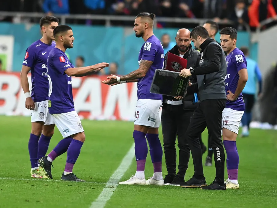 Arbitrul de rezerva Andrei Florin Chivulete si Ionut Voicu alaturi de fotbalistii rapidisti Antonio Valentin Sefer, Alexandru Ionita, Marko Dugandzic si Stefan Calin Panoiu la schimbare in meciul de fotbal dintre FCSB si Rapid Bucuresti, contand pentru Superliga Superbet, desfasurat pe Arena Nationala din Bucuresti, duminica 6 noiembrie 2022. © FOTO:Razvan Pasarica/SPORT PICTURES