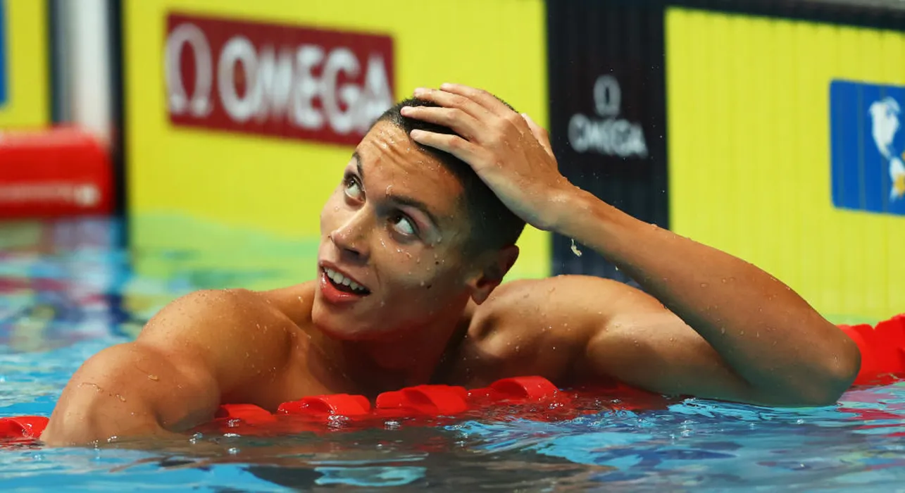 BUDAPEST, HUNGARY - JUNE 21: David Popovici of Team Romania reacts after competing in the Men's 100m Freestyle Semi-Final on day four of the Budapest 2022 FINA World Championships at Duna Arena on June 21, 2022 in Budapest, Hungary. (Photo by Dean Mouhtaropoulos/Getty Images)