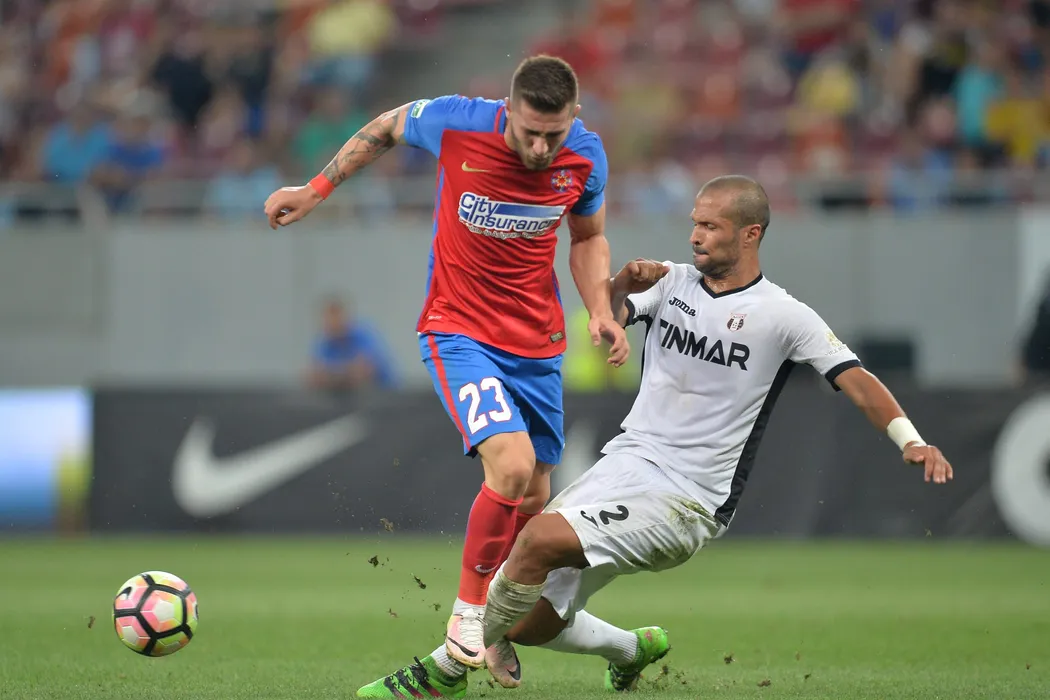 Ovidiu Popescu (S), de la Steaua Bucuresti, lupta pentru balon cu Geraldo Alves (D), de la Astra Giurgiu, in timpul meciului de fotbal din etapa a VII-a a Ligii 1, disputat pe stadionul Arena Nationala din Capitala, duminica, 11 septembrie 2016. ALEXANDRU DOBRE / MEDIAFAX FOTO