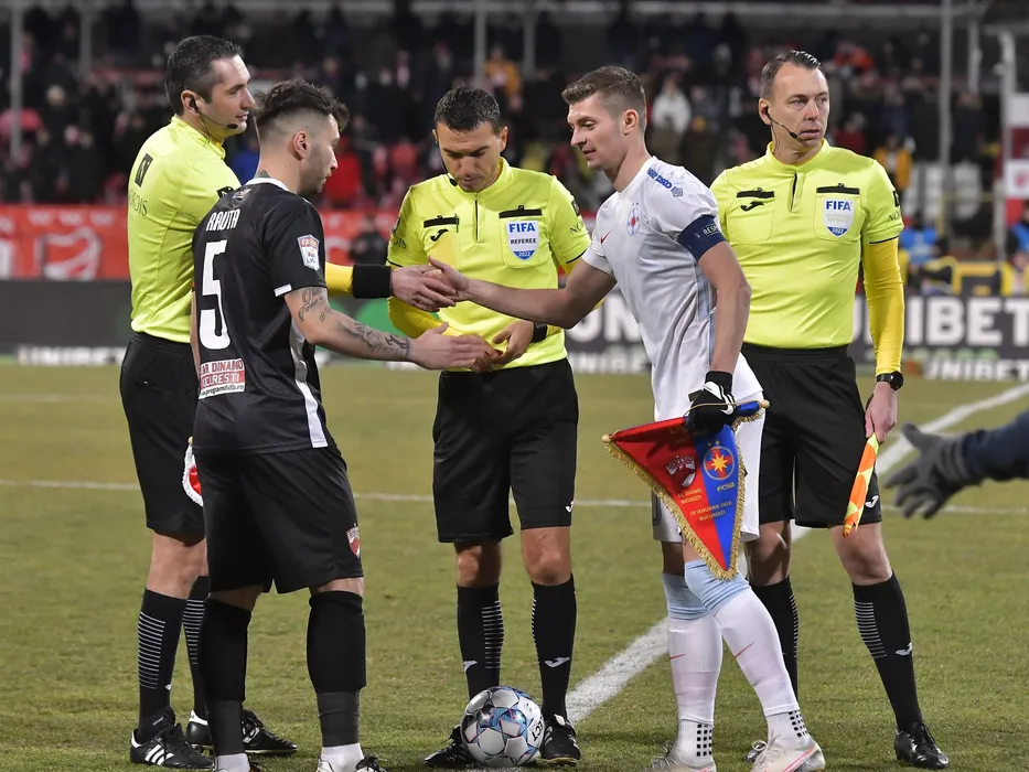 Brigada de arbitri formata din Radu Adrian Ghinguleac, Ovidiu Hategan si Sebastian Eugen Gheorghe intra pe teren alaturi decapitanii Alexandru Ilie Rauta si Florin Lucian Tanase la meciul de fotbal dintre Dinamo Bucuresti si FCSB contand pentru Liga 1 Casa Pariurilor, desfasurat pe Stadionul Dinamo din Bucuresti, duminica 30 ianuarie 2022. © FOTO:Razvan Pasarica/SPORT PICTURES