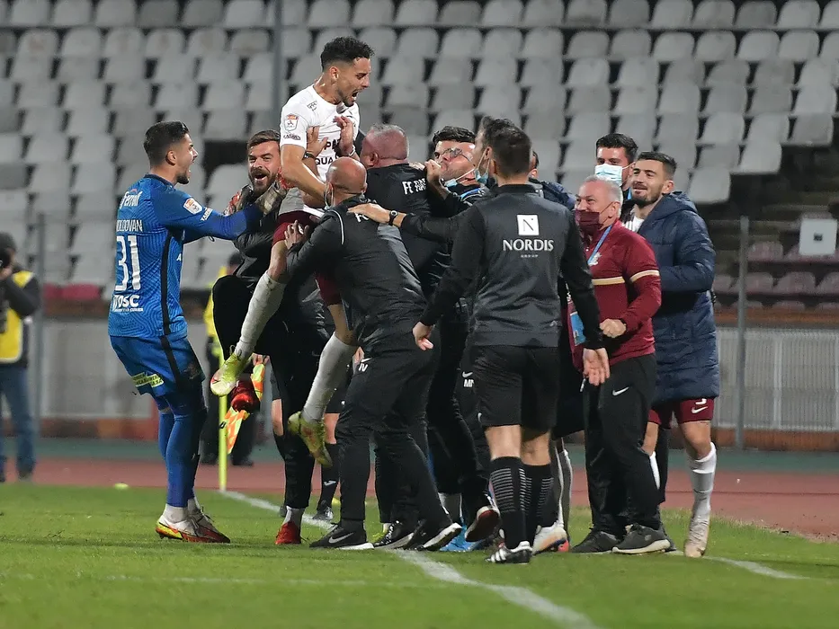 Bucurie rapidista cu Horatiu Alexandru Moldovan, Nicolae Carnat si Adrian Ionut Balan dupa un gol marcat in meciul de fotbal dintre Dinamo Bucuresti si Rapid Bucuresti, contand pentru Liga 1 Casa Pariurilor, desfasurat pe Stadionul Dinamo din Bucuresti, sambata 23 octombrie 2021. © FOTO:Razvan Pasarica/SPORT PICTURES