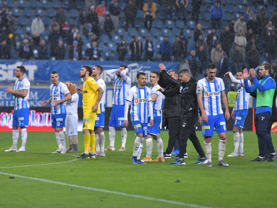 Fotbalistii craioveni Mirko Pigliacelli, Marius Marcel Constantin, Lyes Hafid Houri, Bogdan Ilie Vatajelu si Andrei Virgil Ivan saluta galeria dupa meciul de fotbal dintre Universitatea Craiova si FCSB, contand pentru Liga 1 Casa Pariurilor, desfasurat pe Stadionul Ion Oblemenco din Craiova, duminica 28 noiembrie 2021. © FOTO:Razvan Pasarica/SPORT PICTURES