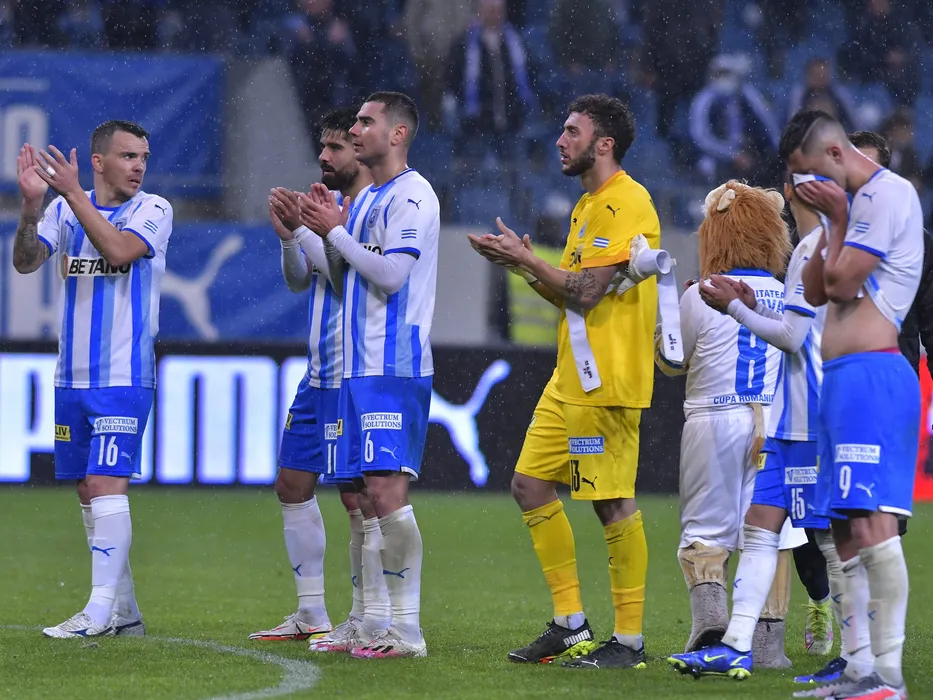 Fotbalistii craioveni Dan Nicolae Nistor, Ionut Daniel Vina, Screciu Vladimir Ionut, Mirko Pigliacelli si Andrei Virgil Ivan saluta galeria dupa meciul de fotbal dintre Universitatea Craiova si FCSB, contand pentru Liga 1 Casa Pariurilor, desfasurat pe Stadionul Ion Oblemenco din Craiova, duminica 28 noiembrie 2021. © FOTO:Razvan Pasarica/SPORT PICTURES