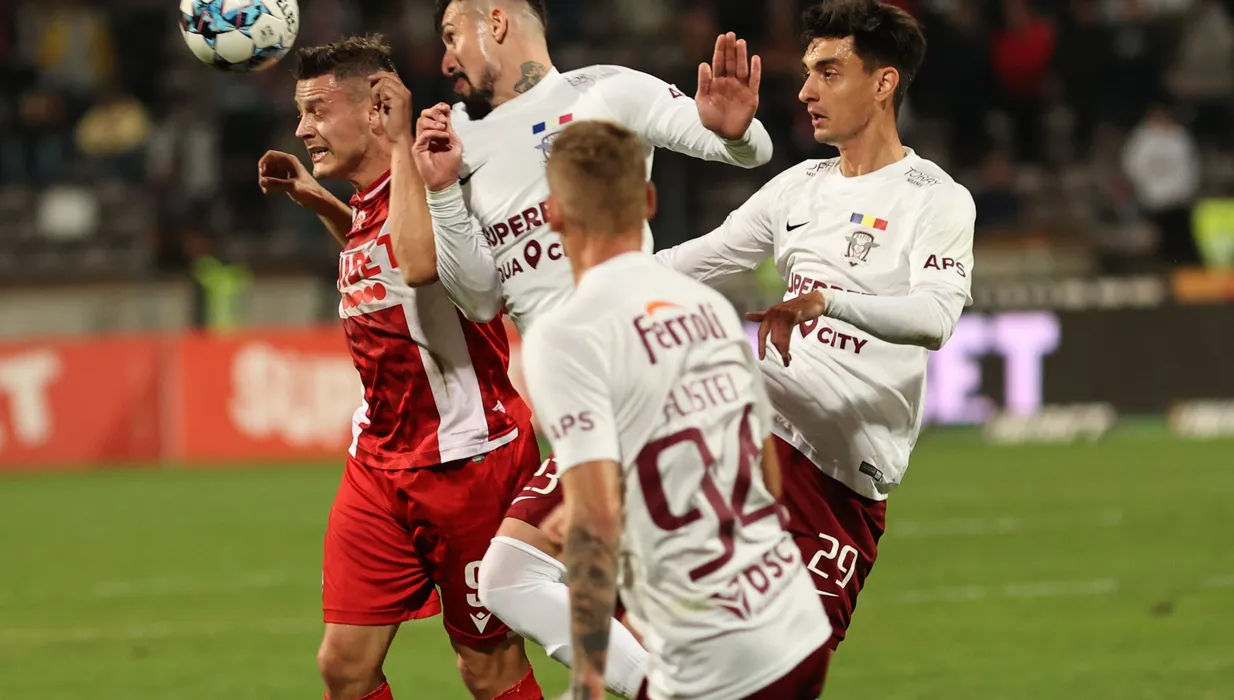 Gabriel Torje (S), de la Dinamo, lupta pentru balon cu Dragos Grigore (C), de la Rapid, in meciul de fotbal din etapa a XIII-a a Ligii 1, disputat pe stadionul Dinamo din Bucuresti, sambata, 23 octombrie 2021. GEORGE FILIP / MEDIAFAX FOTO