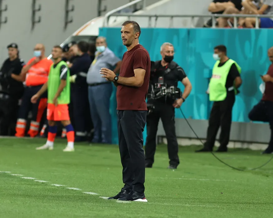 Echipele FCSB (echipament rosu) si Sahtior Karagandy s-au intalnit intr-o partida din prima mansa a ”dublei” din turul doi preliminar al Conference League la fotbal, partida disputata pe Arena Nationala din Bucuresti, joi 22 iulie 2021. GEORGE FILIP / MEDIAFAX FOTO