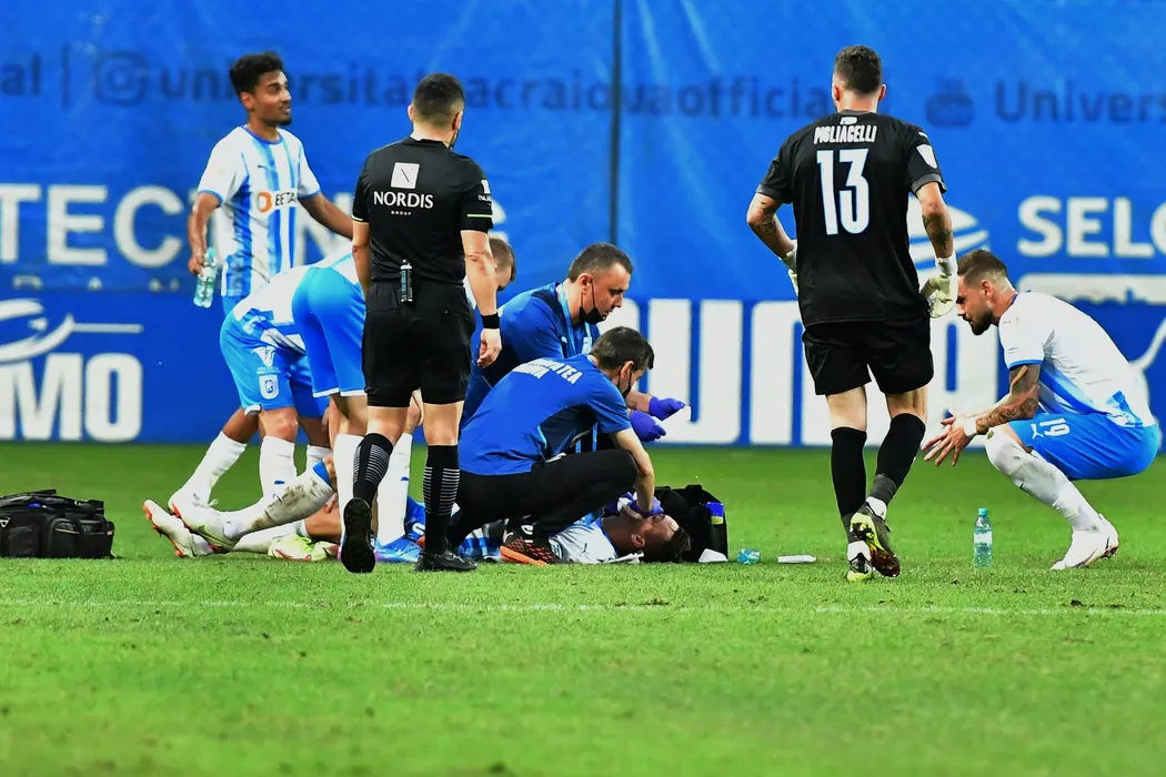Alexandru Mateiu (C), de la CS Universitatea Craiova, primeste ingrijiri medicale dupa ce a fost accidentat in timpul meciului de fotbal contra echipei Gaz Metan Medias din etapa a VI-a a Ligii 1, disputat pe stadionul Complex Sportiv Craiova din Craiova, sambata, 21 august 2021. REMUS BADEA / MEDIAFAX FOTO